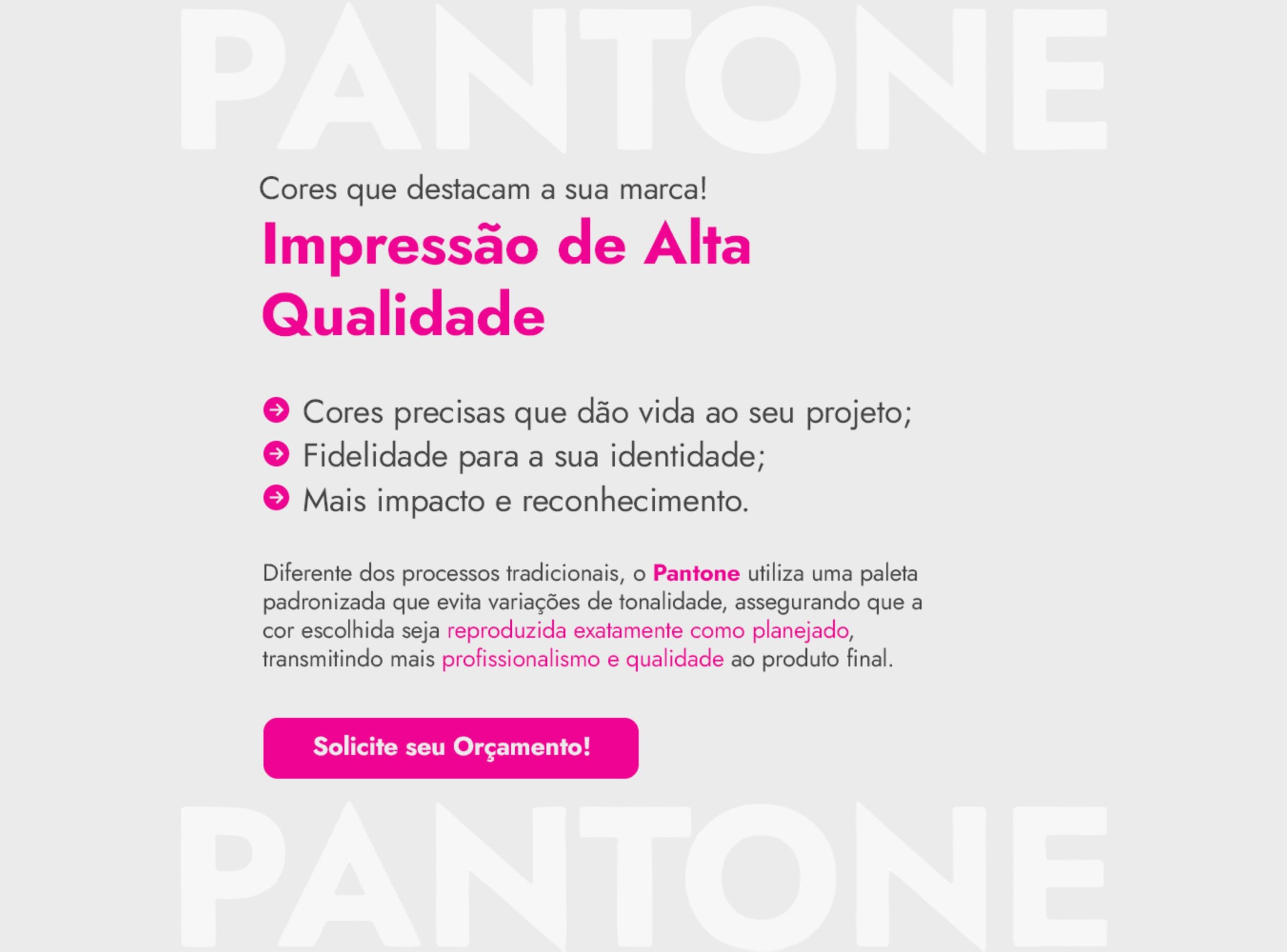 Impressão de alta qualidade com 6 cores, CMYK + 2 Pantones, garantindo: Fidelidade à sua marca. -
